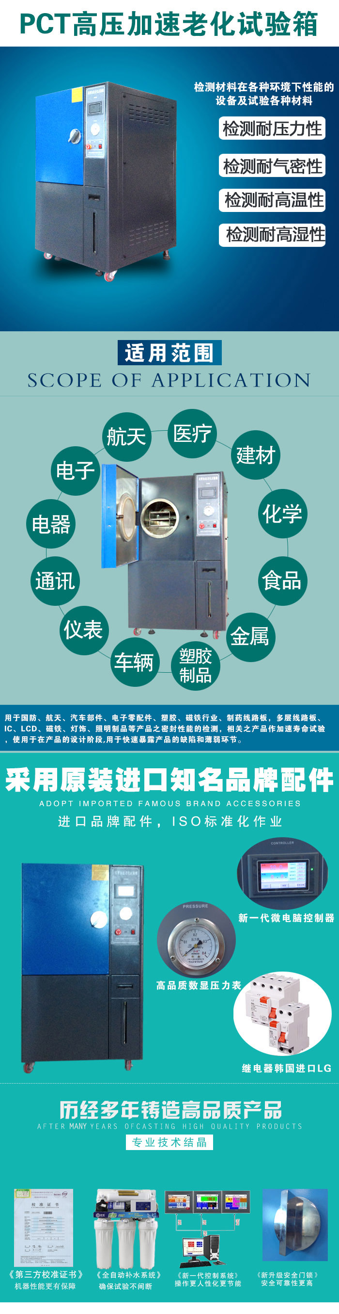 產品用途:高壓加速老化試驗箱適用于國防、航天、汽車部件、電子零配件、塑膠、磁鐵行業、制藥線路板,多層線路板、IC、LCD、磁鐵、燈飾、照明制品等產品之密封性能的檢測,相關之產品作加速壽命試驗,使用于在產品的設計階段,用于快速暴露產品的缺陷和薄弱環節。測試其制品的耐厭性,氣密性。 | |