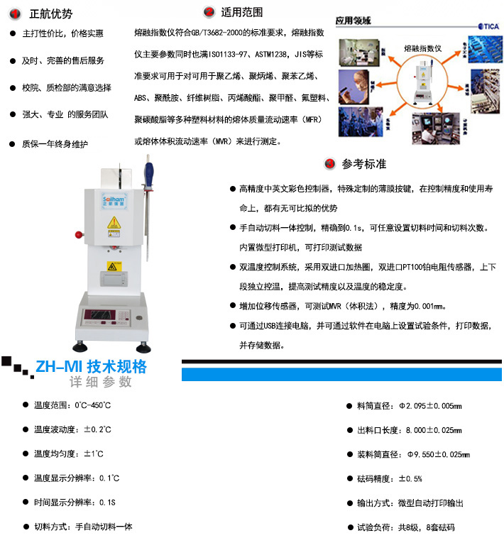 產品用途:熔融指數儀符合GB/T3682-2000的標準要求,熔融指數儀主要參數同時也滿ISO1133-97、ASTM1238,JIS等標準要求可用于對可用于聚乙烯、聚炳烯、聚苯乙烯、ABS、聚酰胺、纖維樹脂、丙烯酸酯、聚甲醛、氟塑料、聚碳酸脂等多種塑料材料的熔體質量流動速率(MFR)或熔體體積流動速率(MVR)來進行測定,廣泛地應用于塑料生產,塑料制品、石油化工等行業以及相關院校、科研單位和商檢部門等。 | |