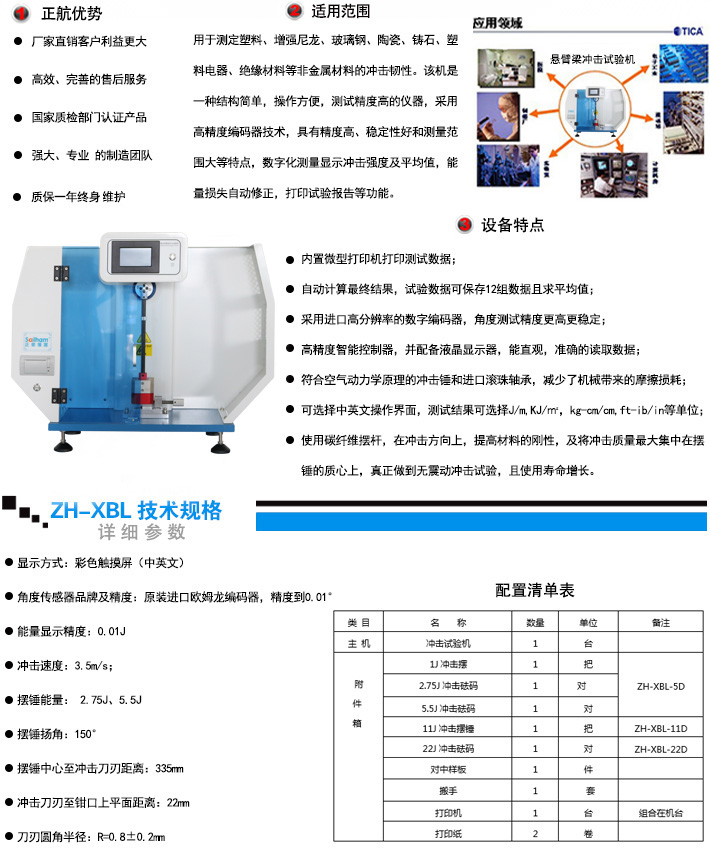 產品用途:懸臂梁沖擊試驗機用于測定塑料、增強尼龍、玻璃鋼、陶瓷、鑄石、塑料電器、絕緣材料等非金屬材料的沖擊韌性。擺錘沖擊試驗機是科研單位、大專院校、非金屬材料生產廠家進行質量檢驗的常用設備,該機是一種結構簡單,操作方便,測試精度高的儀器,數顯沖擊試驗機采用高精度編碼器技術,具有精度高、穩定性好和測量范圍大等特點,數字化測量顯示沖擊強度及平均值,能量損失自動修正,打印試驗報告等功能。 | |